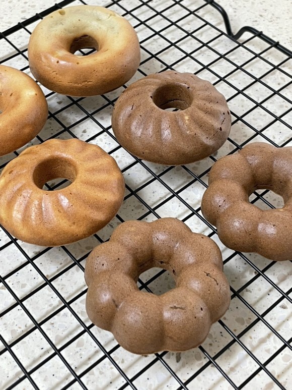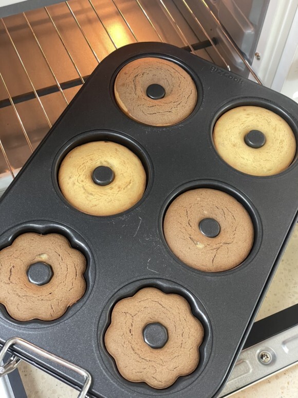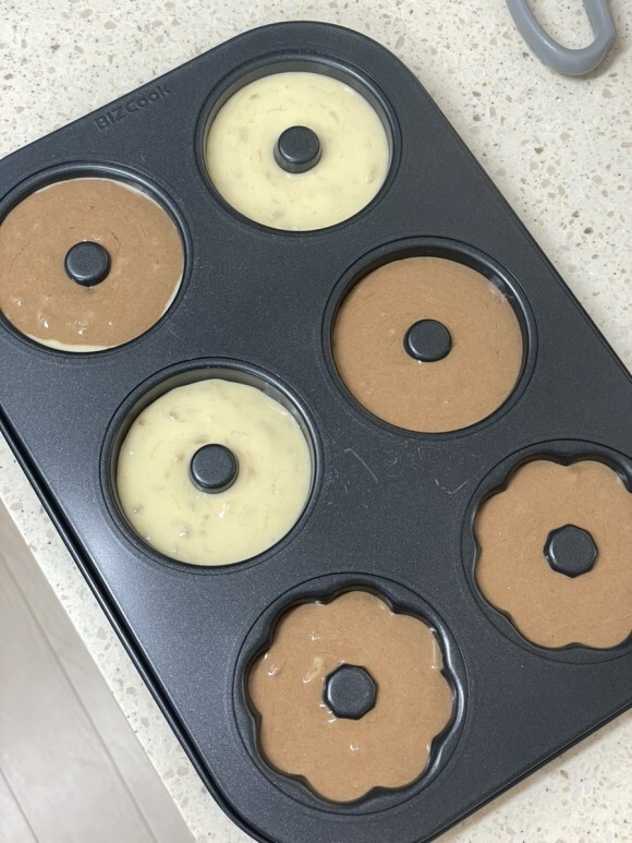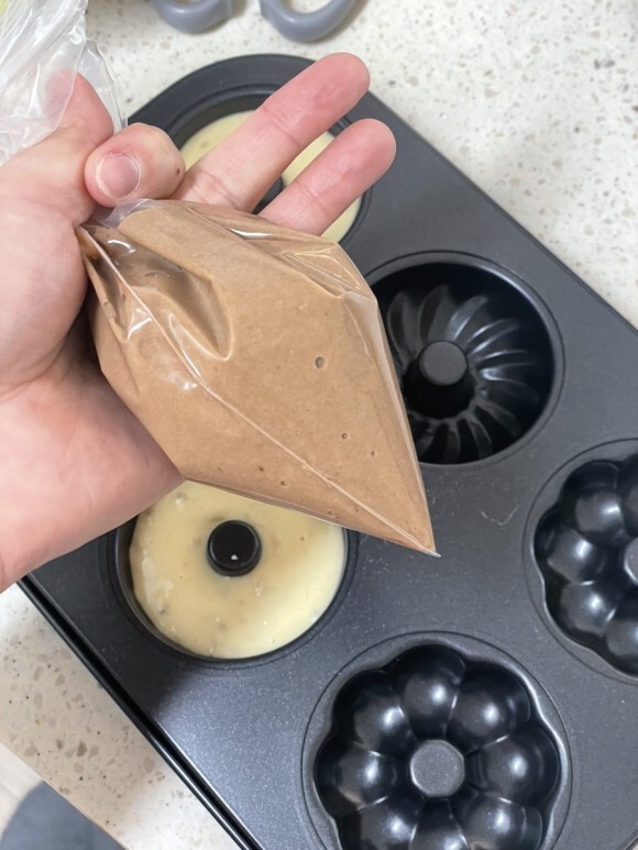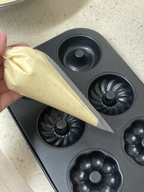 반죽의 반을 짤주머니에 넣고 도넛 틀에 짠다.