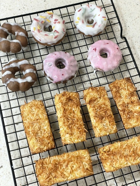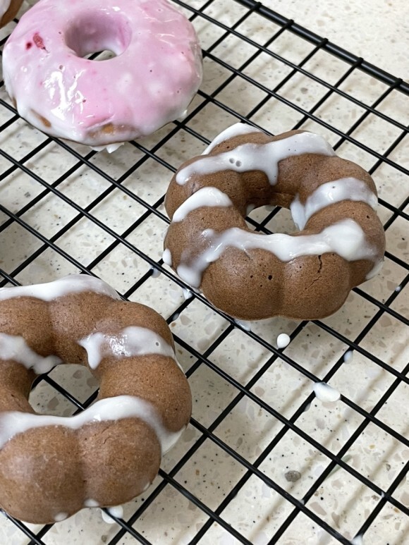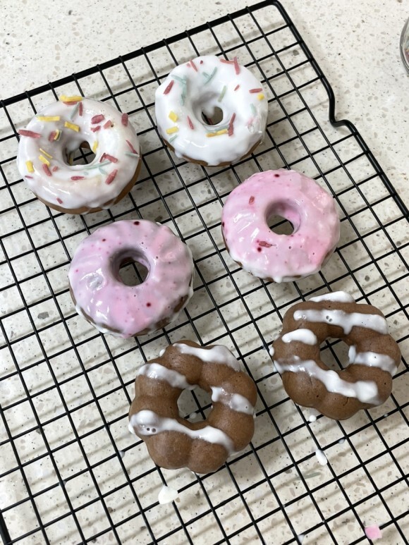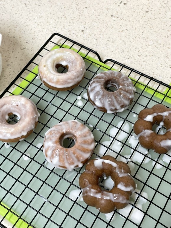 도넛을 꺼내어 한 김 식힌다.