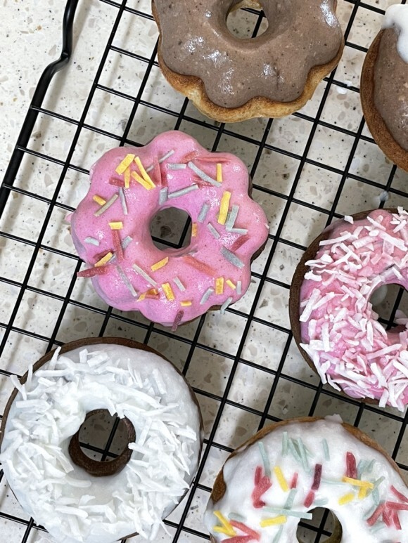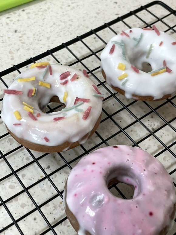 남은 우유에 비트가루를 넣어 분홍색을 만들어 도넛을 찍는다.