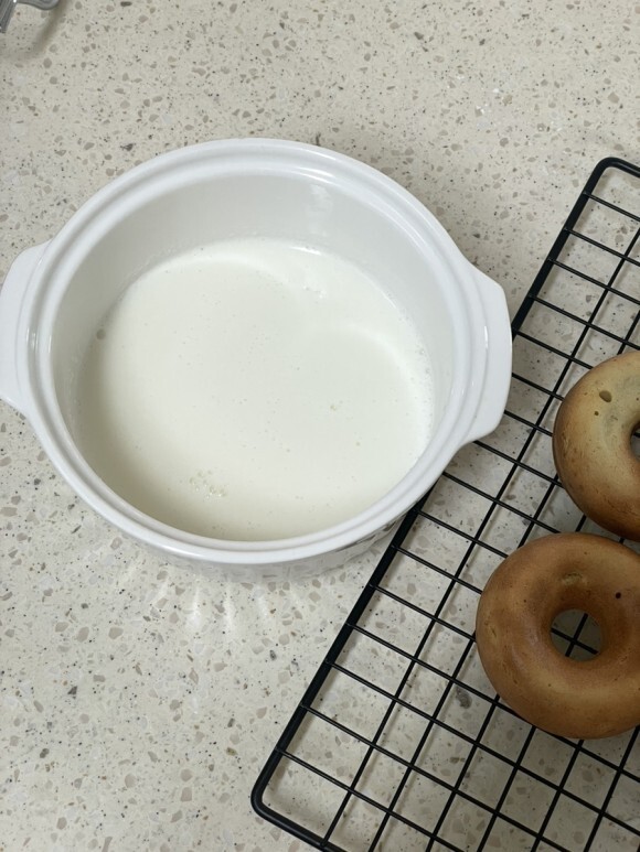 도넛이 익는동안 우유에 한천가루를 섞어 약불에 끓인다.